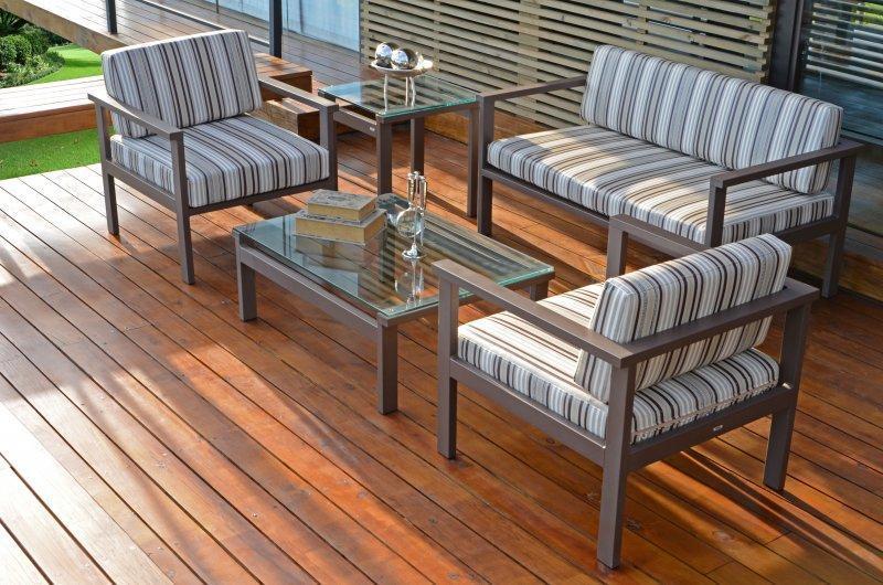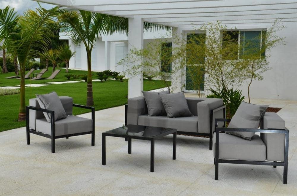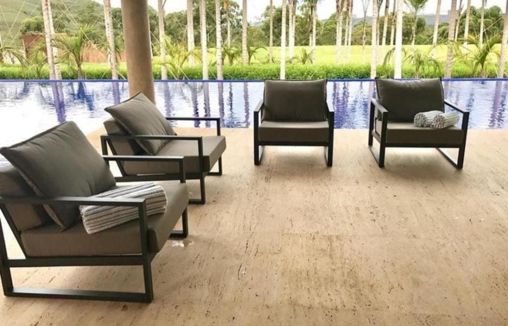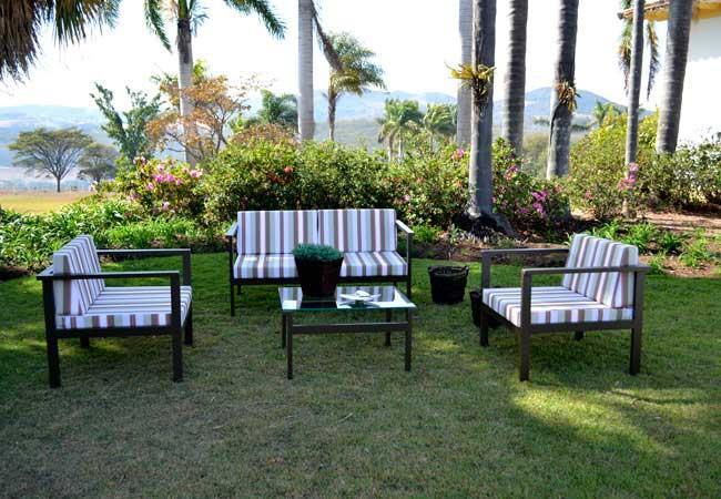 Jogo de sofá com estrutura em alumínio tubular e pintura eletrostática, almofadas impermeáveis, que bloqueiam líquidos, poeiras e fungos. São leves e protegidos com aditivos anti-Uv que evitam o ressecamento e a descoloração.